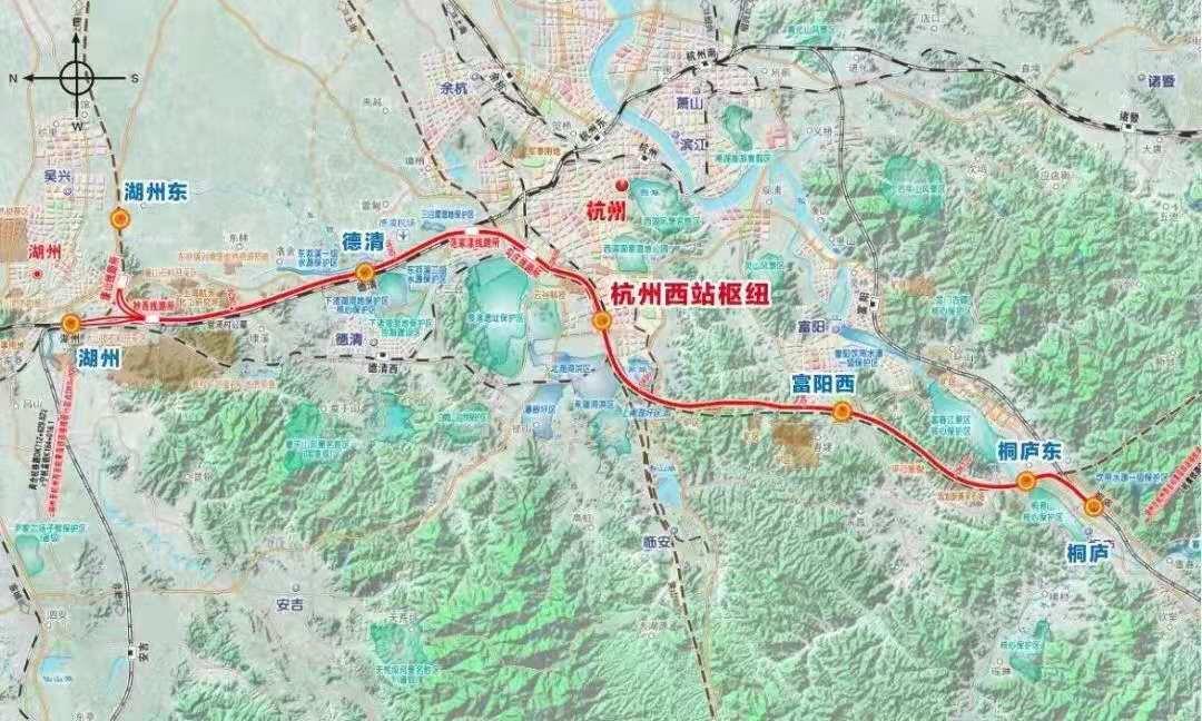 湖杭鐵路是杭州西站南北向引入的高鐵線路。項(xiàng)目由新成立的湖杭鐵路有限公司負(fù)責(zé)建設(shè),委托鐵路上海局集團(tuán)公司指定的滬昆客運(yùn)專線浙江公司負(fù)責(zé)代建,建成后也將委托鐵路上海局集團(tuán)運(yùn)營管理。北段湖州至杭州西是商合杭鐵路的組成部分,南段杭州西至桐廬既是杭黃鐵路連接線,又是杭溫鐵路的組成部分。線路從既有寧杭高鐵湖州站引出,經(jīng)湖州市南太湖新區(qū)、吳興區(qū)、德清縣,杭州市余杭區(qū)、西湖區(qū)、富陽區(qū)和桐廬縣,跨富春江新設(shè)桐廬東站后引入杭黃高鐵桐廬站,新建線路長約136公里(含杭臨績鐵路等同步實(shí)施工程),設(shè)計(jì)時(shí)速350公里。全線設(shè)車站6座,其中利用既有站2座(湖州站、桐廬站),改建既有車站1座(德清站)、新建車站3座(杭州西站、富陽西站、桐廬東站)。本項(xiàng)目還包括在擬建滬蘇湖鐵路預(yù)留位置新建的湖州東站。